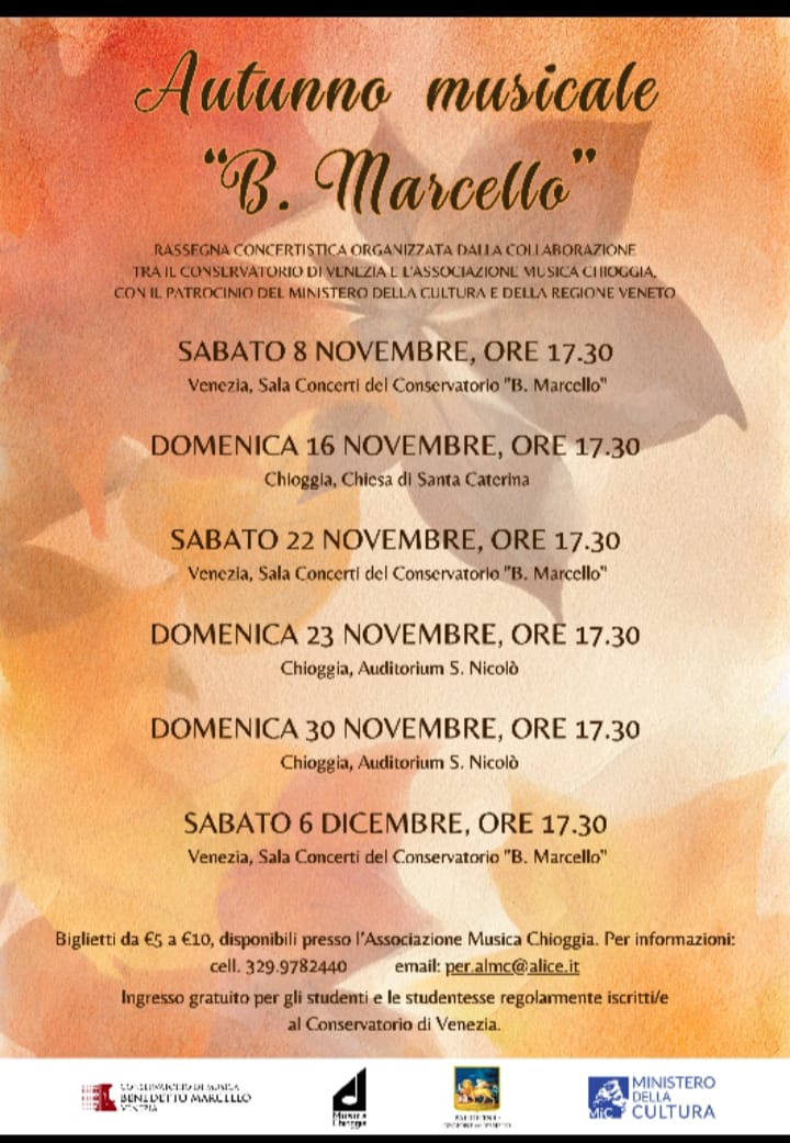 Rassegna concertistica organizzata dalla collaborazione tra il Conservatorio di Venezia e l’Associazione Musica Chioggia. Con il patrocinio del Ministero della Cultura e della Regione Veneto